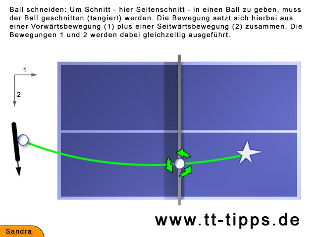 Um Seitenschnitt in einen Ball zu geben, muss der Ball geschnitten (tangiert) werden. Die Bewegung setzt sich hierbei aus einer Vorwärtsbewegung des Tischtennisschlägers plus einer Seitwärtsbewegung zusammen. Die Bewegungen werden dabei gleichzeitig ausgeführt. In der Abbildung erhält der Tischtennisball Linksrotation.-