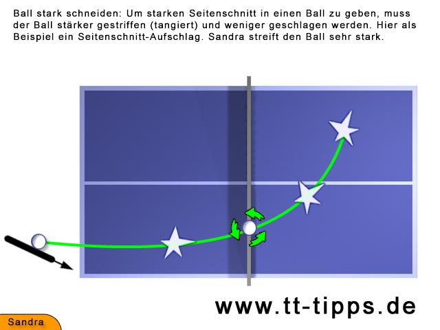 Um starken Seitenschnitt in einen Ball zu geben, muss der Ball stärker gestriffen (tangiert) und weniger geschlagen werden. Hier als Beispiel ein Seitenschnitt-Aufschlag mit starker Linksrotation. Grundsätze zur Rotation- Je stärker die Streifbewegung ausfällt, desto mehr Schnitt kommt in den Ball.