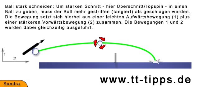 Um starken Überschnitt in einen Ball zu geben, muss der Ball mehr gestriffen (tangiert) als geschlagen werden. Die Bewegung setzt sich hierbei aus einer leichten Aufwärtsbewegung des Tischtennisschlägers plus einer stärkeren Vorwärtsbewegung zusammen. Die Bewegungen werden dabei gleichzeitig ausgeführt. Der Tischtennisball erhält hierbei starke Vorwärtsrotation.-