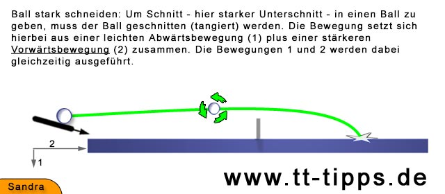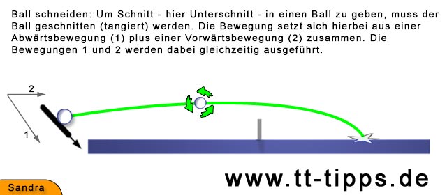 Um Schnitt Unterschnitt in einen Ball zu geben, muss der Ball geschnitten (tangiert) werden. Die Bewegung setzt sich hierbei aus einer Abwärtsbewegung des Tischtennisschlägers plus einer Vorwärtsbewegung zusammen. Die Bewegungen und werden dabei gleichzeitig ausgeführt. Der Tischtennisball erhält hierbei Rückwärtsrotation. Unterschnitt wird sehr häufig beim Aufschlag eingesetzt. Entweder als reiner Unterschnitt, oder als Mischform mit zusätzlichem Seitenschnitt.-