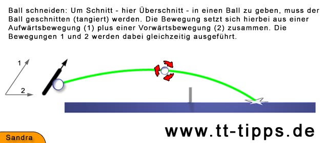 Um Überschnitt in einen Ball zu geben, muss der Ball geschnitten (tangiert) werden. Die Bewegung setzt sich hierbei aus einer Aufwärtsbewegung plus einer Vorwärtsbewegung zusammen. Die Bewegungen werden dabei gleichzeitig ausgeführt. Der Tischtennisschläger ist hierbei in geschlossen. Der Tischtennisball erhält hierbei Vorwärtsrotation-