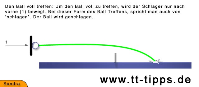 Um den Ball voll zu treffen, wird der Schläger nur nach vorne bewegt. Bei dieser Form des Ball Treffens, spricht man auch vom Schlagen oder Schießen. Der Ball wird geschlagen bzw. geschossen. Dem Tischtennisball wird hierbei keine eigene Rotation mitgegeben. Der Tischtennisball wird zentral in der Schlägermitte getroffen. Er kann beim Rückschlag dann jedoch noch die Rotation vom Gegner haben. Vom Schießen reden wir, wenn ein vom Gegner unterschnittener Ball fest zurückgeschlagen wird. Durch die ursprüngliche Rotation vom Gegner (Unterschnitt) geht der Ball “automatisch” nach unten. Die Flugbahn verläuft dann jedoch eher geradlinig, und nicht wie hier auf der Abbildung.-